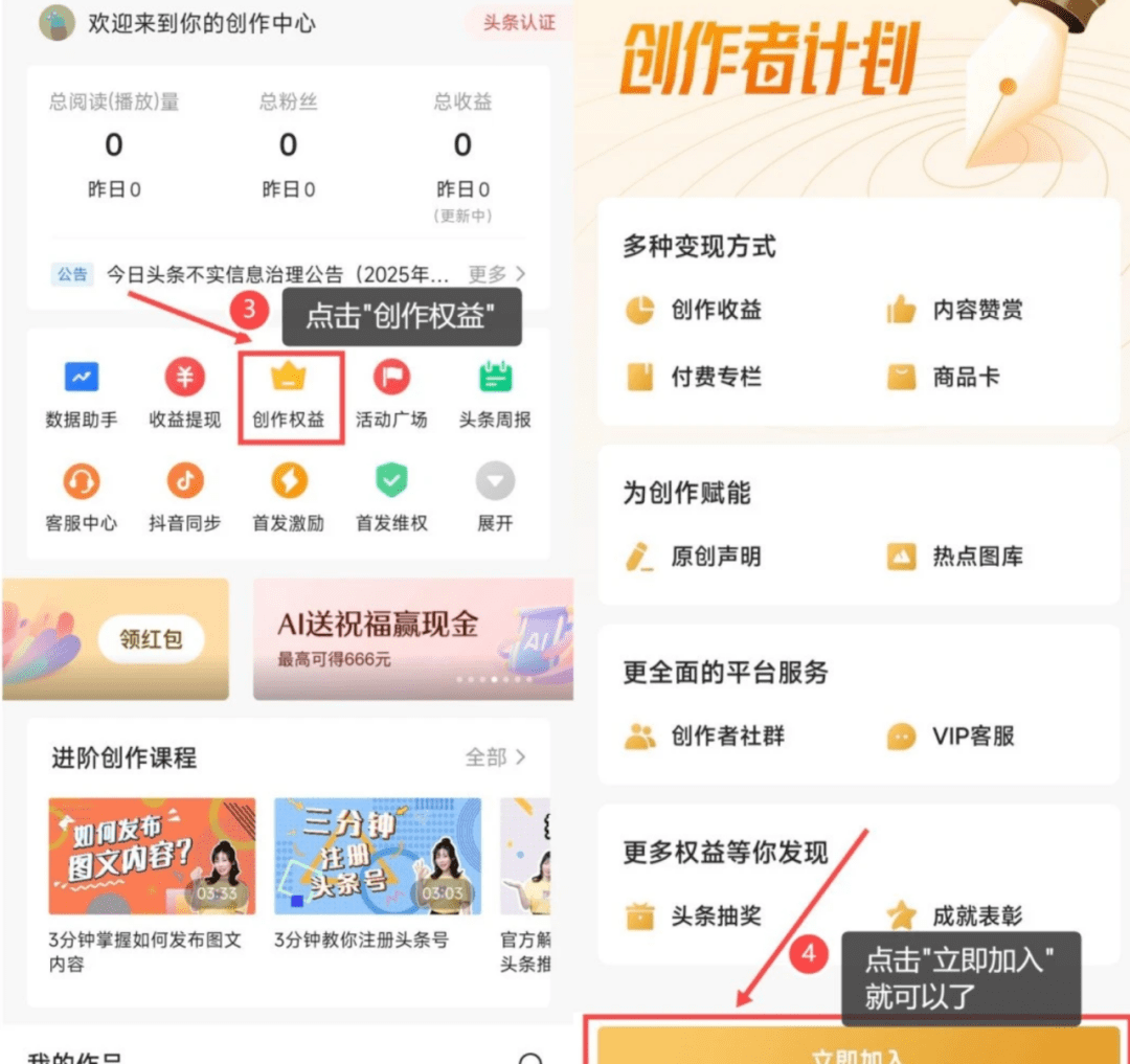 先下载今日头条,登录后点【我的】,找到【全部】,再点【创作中心】,接着点【创作权益】,最后点【立即加入】,0 粉开通微头条收益就搞定啦。之后发文有阅读量就有收益。