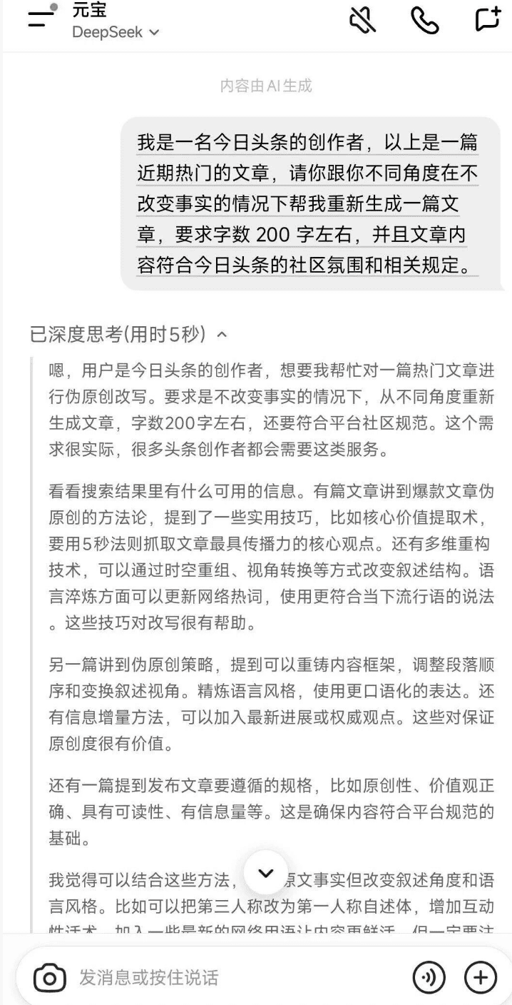 复制对标账号流量高的文章,发给腾讯元宝,让它把字数控制在 200 字左右,经它改写就成原创啦。