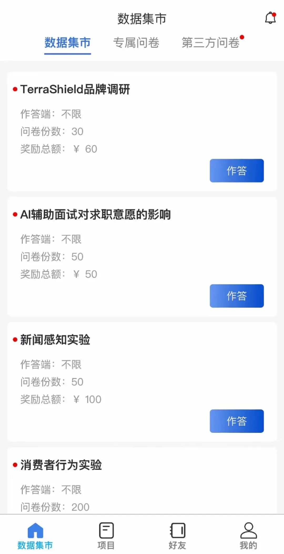 问卷平台,没事去做做赚点小钱还是可以的,主要就是一些企业或者学校为了调研一些事情给到平台的问卷,然后你去回答了就会有奖励,一份几块钱