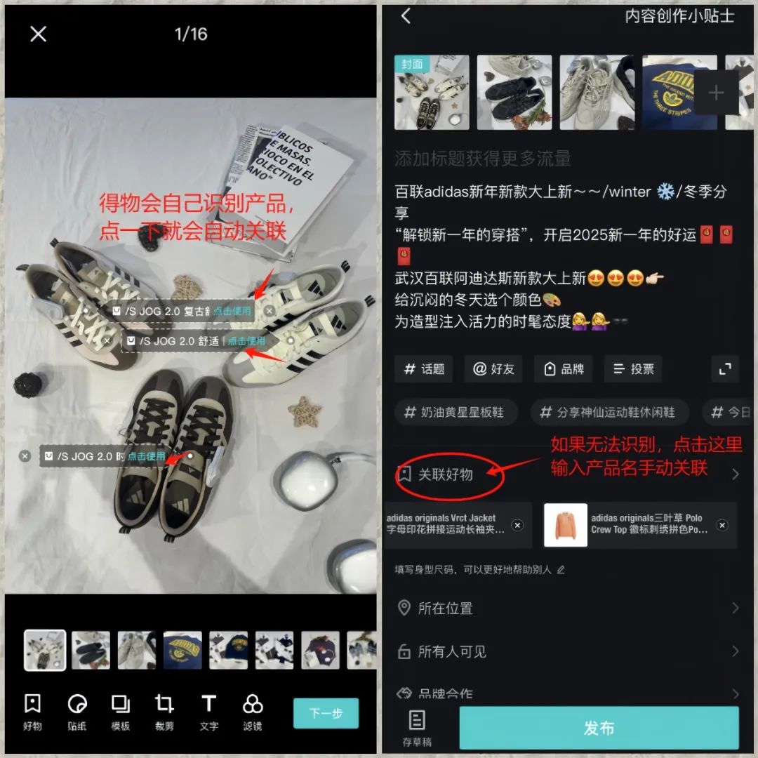 4.打开 得物APP,点击 发布动态。把提取好的文案和图片粘贴进去。关联 相关商品,然后发布。
