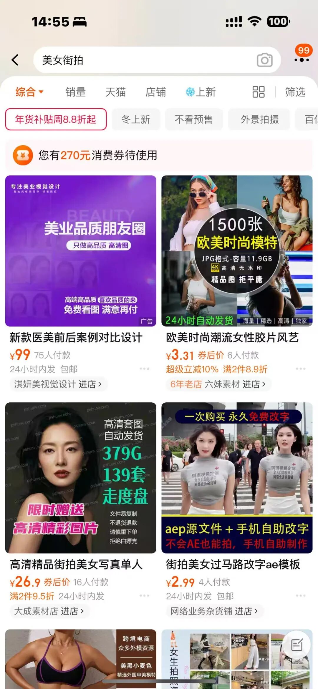 首先第一可以直接去别的短视频平台搜索美女街拍,找一些近期最新发布的,这样的作品可以没有被用过,直接去水印下载下来,然后给图片加个滤镜啊贴纸啊就可以发布了。