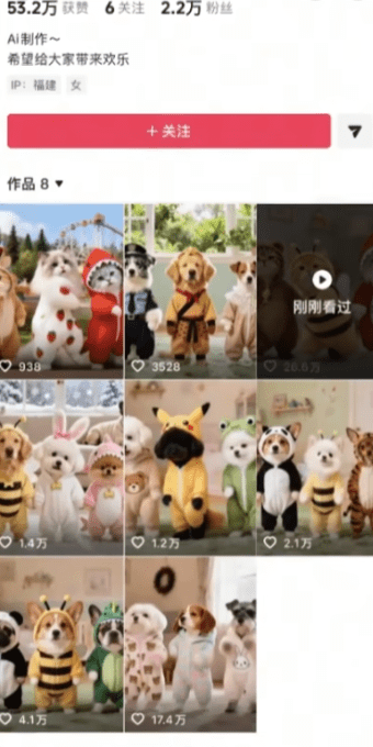 另外,这个赛道让AI赋予的创意无限,每个视频不重样,能给用户的新鲜感持续在线,今天可以让柴犬跳复古disco,明天能让橘猫跳女团舞,还能定制服装和舞台背景,这种不断的迭代的创意感,让观众永远期待下一个视频,根本不会腻,自然愿意点赞、收藏、反复刷,主动分享。