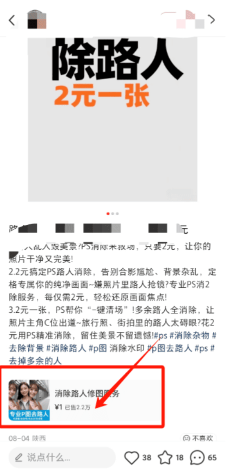 这类在小红薯上非常火,需求很大,而且去除路人也不需要你会ps,用一些软件就可以去除,比如ai,或者美图设计室等等,有些人不知道,就可以利用这个信息差来賺钱,一单9.9、纯利润。