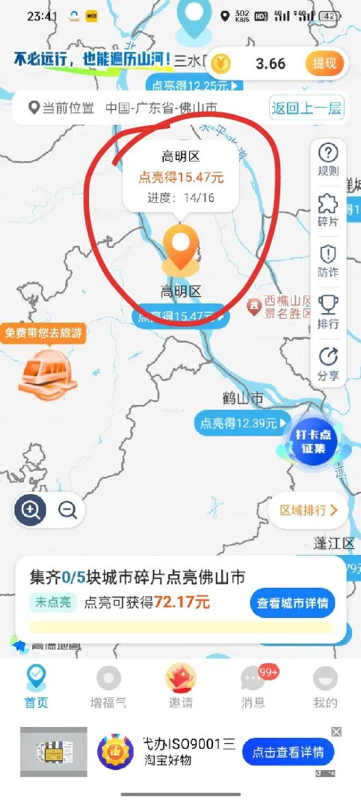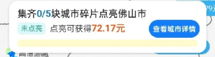 点亮一个区之后区领了 15 米,可以接着点亮下一个区,当你把一个市的所有区都点亮,就能拿到 72 米的奖励!