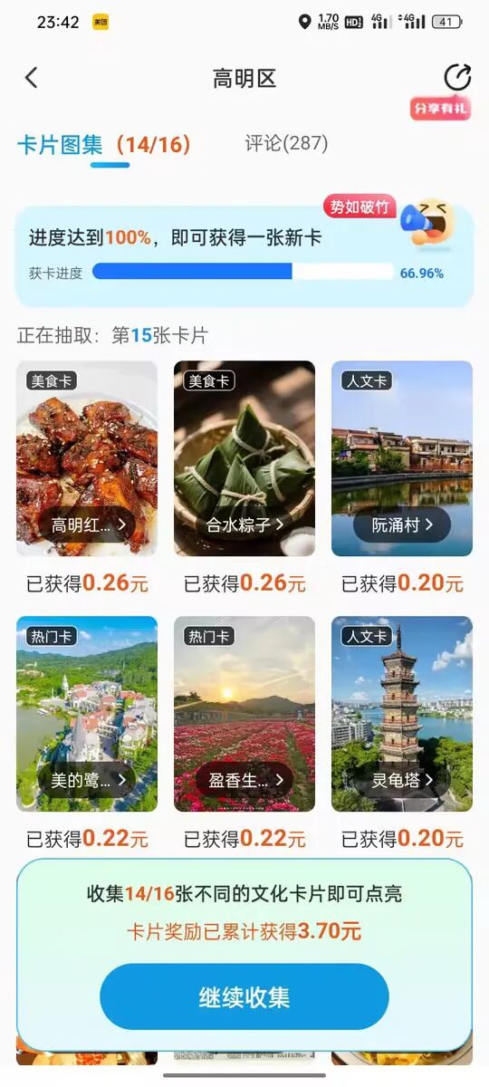 可以看到我现在只剩两张卡片,就可以点亮这个区,获得15.47米了,点击“继续收集”,再点击“看视频加进度”,会出现一个 30 秒广告视频,看完就可以解锁卡片了,整个玩法非常简单