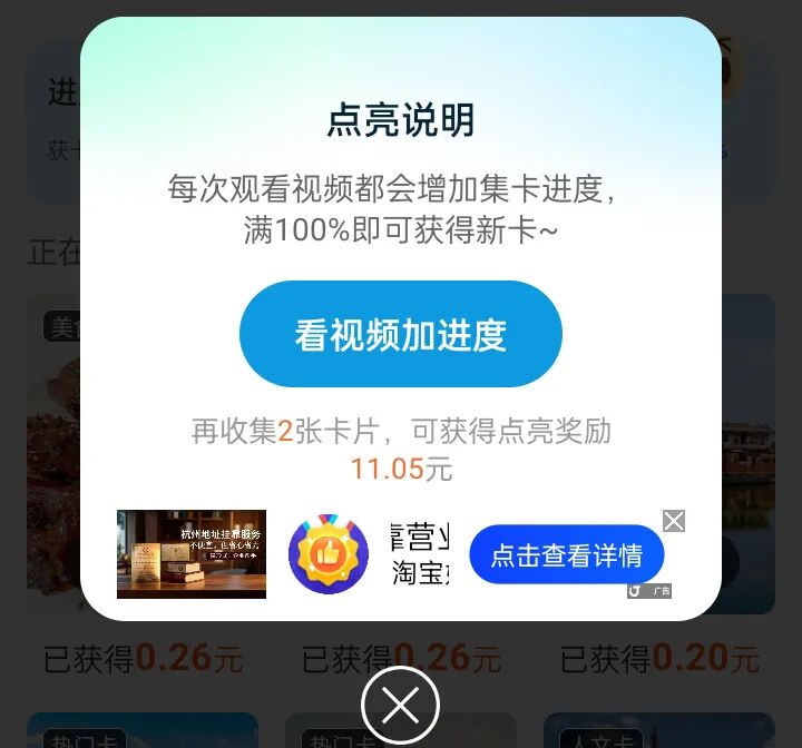 那怎么点亮呢?很简单,每个区只要集齐10-20张卡片即可,咱们就是看广告视频就可以获得卡片。