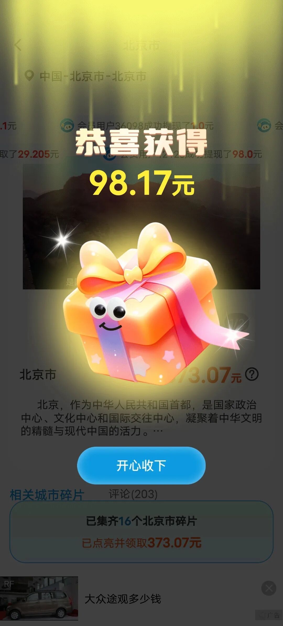 在后续操作中,我点亮了佛山市,获得了 72.17 米。后续又点亮了北京市,获得了 98 米,这一天也拿到了 170 米