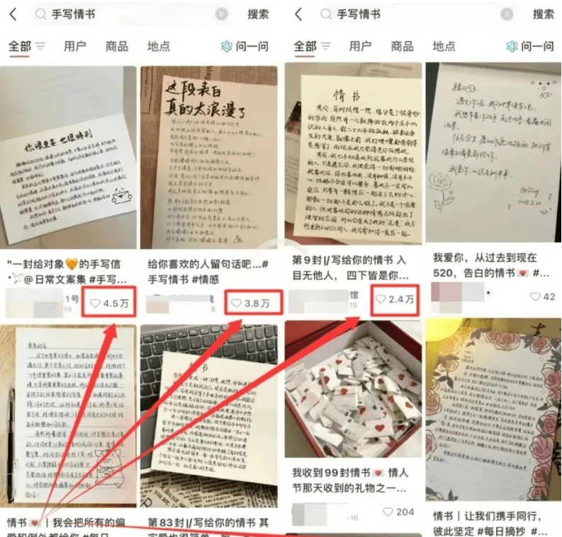 小红书搜索“手写情书”、“手写贺卡”等关键词,把点赞量超过2000的笔记全部收藏,然后把文案复制下来。