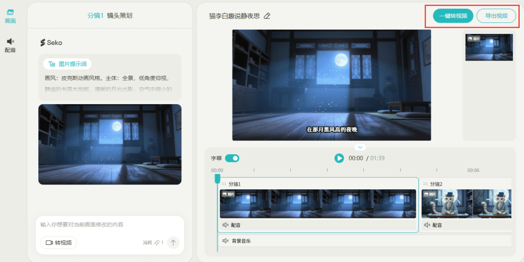分镜生成完生成后,我们可以修改分镜画面,以及每个分镜对应的文案和配音。直到所有分镜无误,再进行一键转视频,以及后续的导出视频。