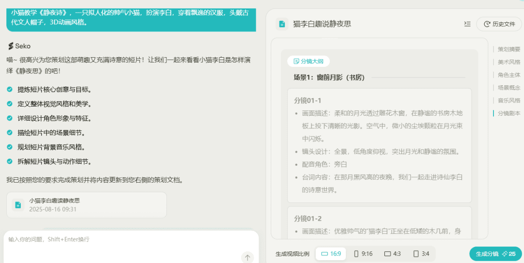 可以看到seko会先提炼短片的内容策划,然后确定风格、主体、场景、配乐、脚本等。