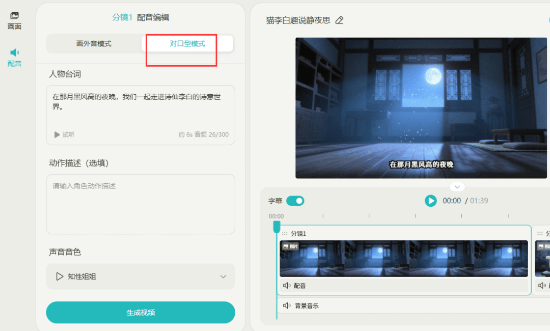 如果我们想要视频中的人物说话,还可以在左侧菜单栏的配音中选择对口型的功能。不仅可以对口型,还可以在对口型的时候,让人物做不同的动作。