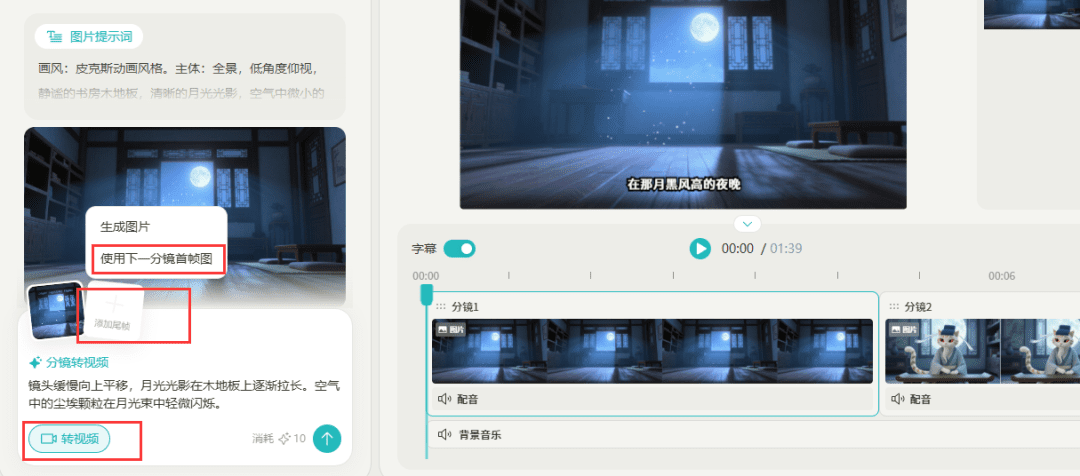 点击单独的分镜图片,然后在左下方进行转视频。就会出现一个添加尾帧,直接选择使用下一分镜首帧图即可。