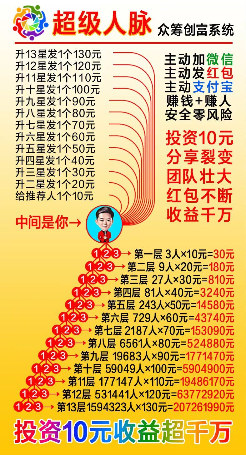 超级人脉通过简単的10圆启动姿琻,为广大用户提供了一个稳定、可靠且易操作的赚钱平台。无论你是刚刚踏入职场的大学生,还是忙碌的上班族,抑或是有闲暇时间的宝妈,这个平台都能为你提供一个轻松实现财富增值的机会。只需要通过简単的推广和裂变,你就能实现人脉和财富的双重增长。如果你也想把握这个千载难逢的机会,不妨加入超级人脉系统,开始你的赚钱之旅吧!