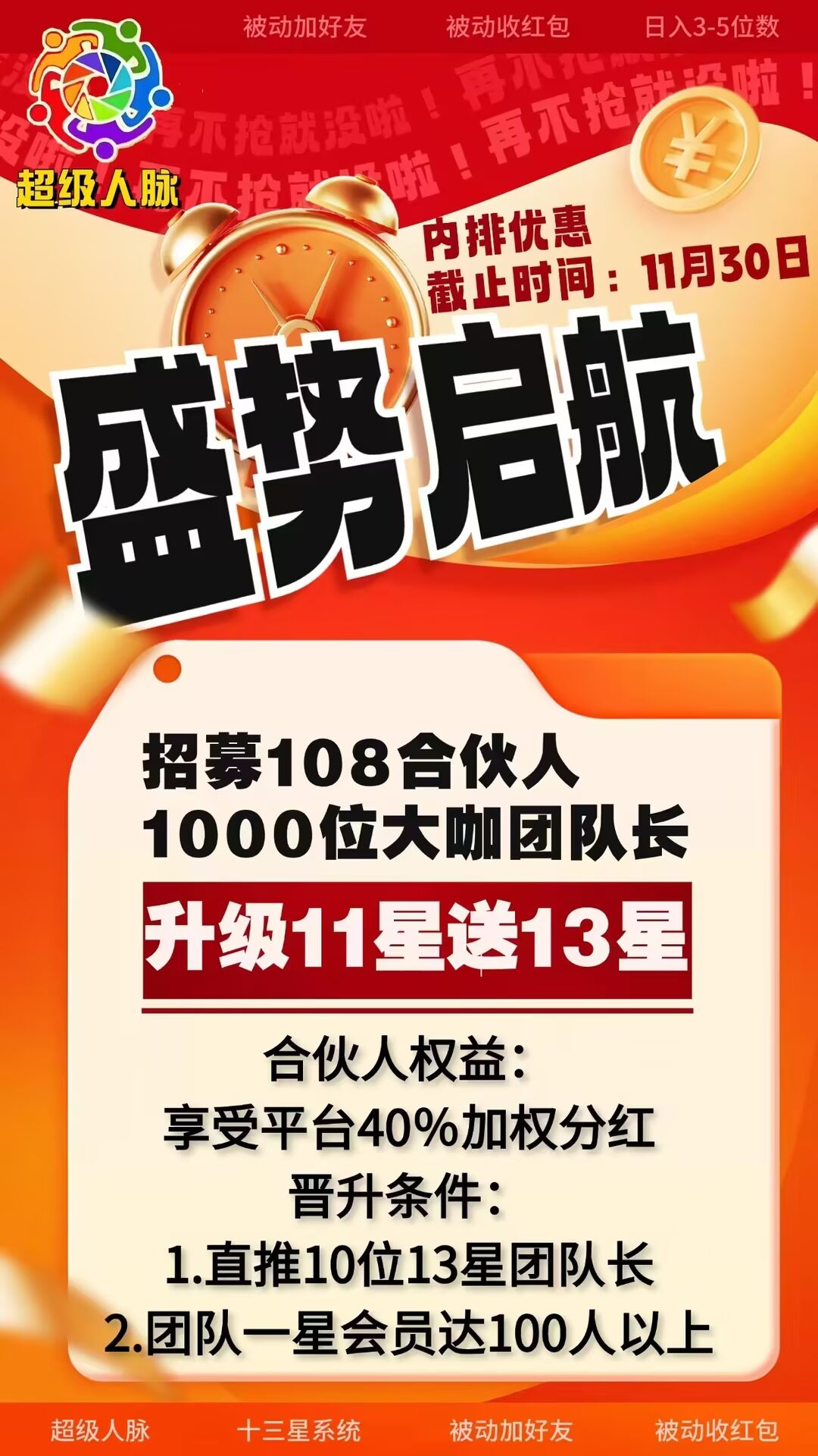 超级人脉系统是一款通过社交裂变和人脉互帮机制来实现财富变现的平台。它的操作非常简単,用户只需花费10圆就可以启动自己的赚钱之路,并且不需要任何额外的费用和绑定手续。通过这个系统,用户不仅能够扩展自己的社交圈,还能实现收入的稳步增长。平台的设计理念是通过简単的操作,让每个人都能轻松赚取财富,并且确保姿琻安全,发展稳定。